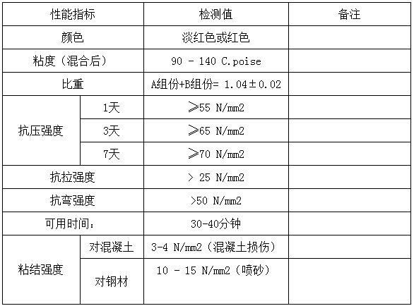 8、也可以作為結(jié)構(gòu)性修補(bǔ)混合物來修復(fù)受損的混凝土。作為復(fù)合灌漿修補(bǔ)混凝土中的錨定螺栓和錨狀物,并通過混合骨料后用于橋梁、甲板護(hù)沿的混合。